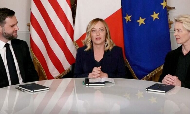 Bojový americký viceprezident JD Vance se dnes usmíval, když se setkal s italským premiérem Giorgií Meloni a prezidentem Evropské komise Ursula von der Leyen – ale stále si nemohl pomoci, aby se Amerika s EU „neshodovala“. Čtyřicetiletý nejprodávanější autor byl dnes uvítán italským premiérem, který dnes pořádal trilaterální rozhovory mezi USA, EU a Itálií v Římě.