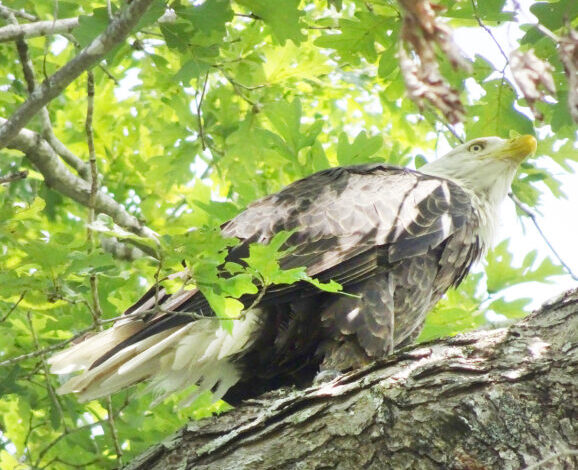 Foto od Grace Johnson a bělohlavý orel sedí na větvi v letovisku Stonewall v Roanoke poblíž Westonu. Pták vzal rybu, kterou chytil v nedalekém jezeře do stromu na jídlo.