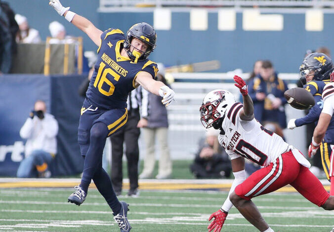 Foto s laskavým svolením BlueGoldNews.com WVU přijímač Jeff Weimer se pokouší vytáhnout průsmyk během sobotní prohry s Texas Tech.