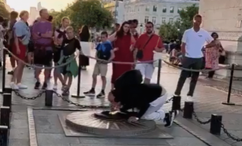Video ukazuje, že jednotlivec prochází posvátným místem na Champs-élysées, než se krčí, aby zapálil cigaretu z plamene, který od roku 1923 spálil nepřetržitě.