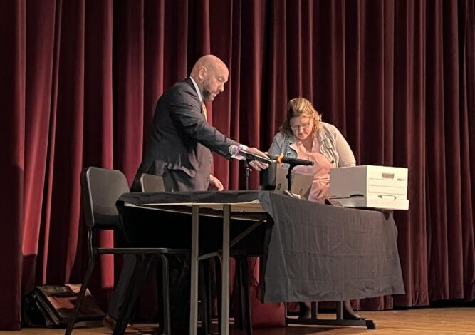 Inter-hory photo od Edgara Kelleyho Randolph County School Superintendent Dr. Shawn Dilly se připravuje na úterní večerní setkání Board of Education na Elkins High School Auditorium spolu s výkonnou tajemníkem Jessica Isner.