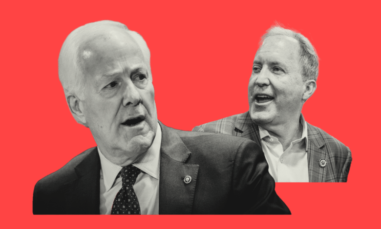 John Cornyn, vlevo a Ken PaxtonIlustrace matky Jones; Douglas Christian/Zuma; Bob Daemmrich/Zuma