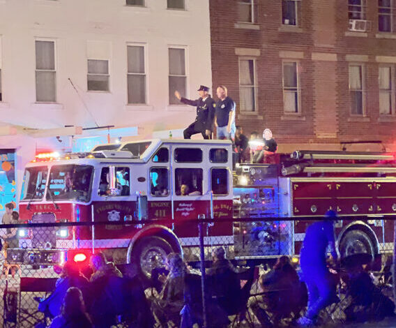 Inter-horou photo od Edgara Kelleyho, hasičský motor s hasičkou Tygart Valley Fire Company, prochází v pátek večer během Davis Avenue v Elkins během přehlídky Festivalu Festivalu Mountain State Forest.