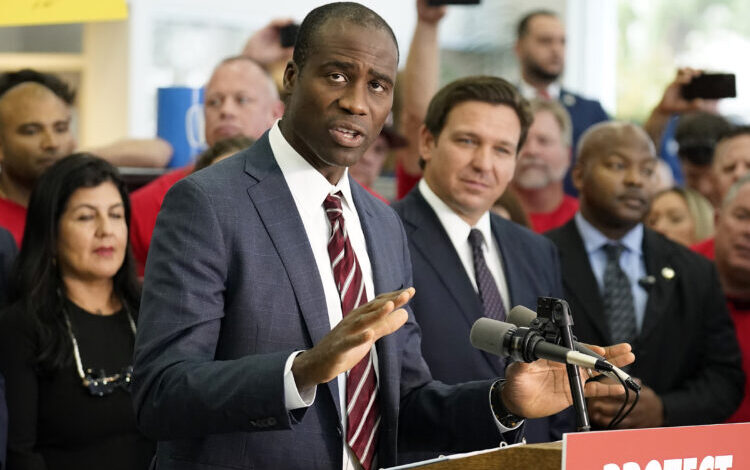 Soubor – Generální chirurg na Floridě Dr. Joseph Ladapo gesta, když hovoří s příznivci a členy médií před podpisem zákona Gov. Ron DeSantis, 18. listopadu 2021, v Brandonu, Florida (AP Photo/Chris O’Meara, spis)