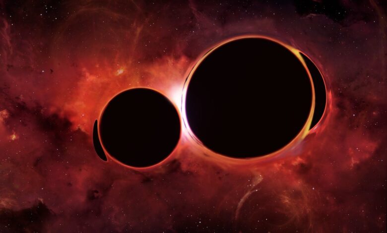 Ilustrace dvou černých děr obíhajících se navzájem.