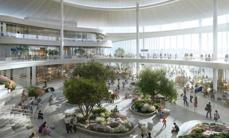 - Oculus Spaces: budou vytvořeny dva stávkující Oculus (kupole podobné otvory) a v terminálu nabízejí nezapomenutelné „aténské momenty“. North Oculus bude představovat svěží středomořskou zahradu v velkém kruhovém prostoru s vysokým výškou 24,5 metrů, zatímco South Oculus nabídne tři řadové úrovně sedadel a krajinných oblastí a vytvoří příjemnou a uvolněnou atmosféru.