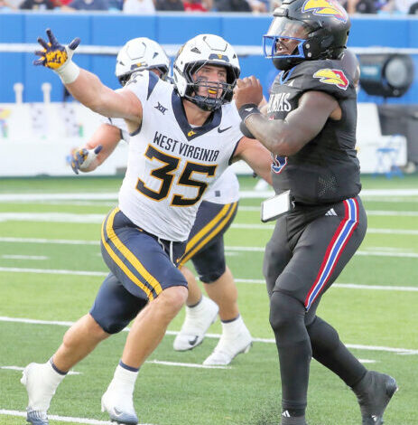 Foto s laskavým svolením BluegoldNews.com WVU Linebacker Reid Carrico získá tlak na Kansas quarterback Jalon Daniels během sobotní soutěže Big 12 Conference.