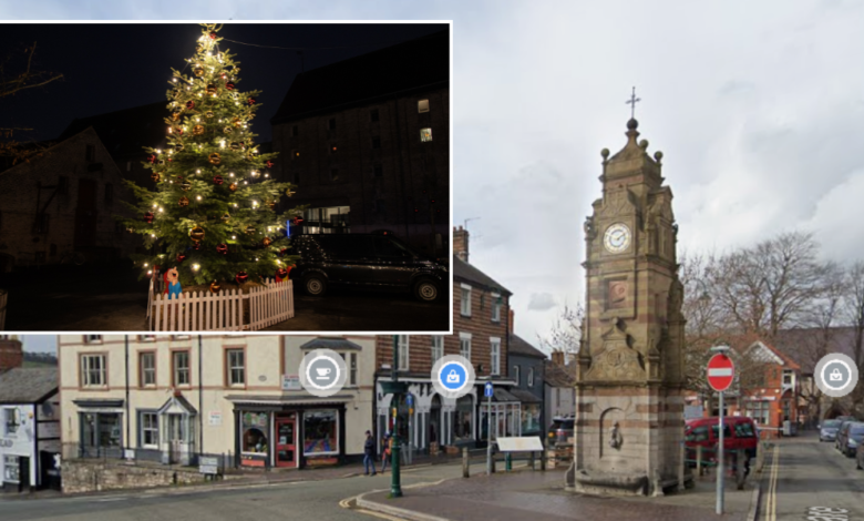 Slavnostní výstava na náměstí svatého Petra v Ruthinu v severním Walesu byla poškozena, když se někdo pokusil vylézt na evergreen.