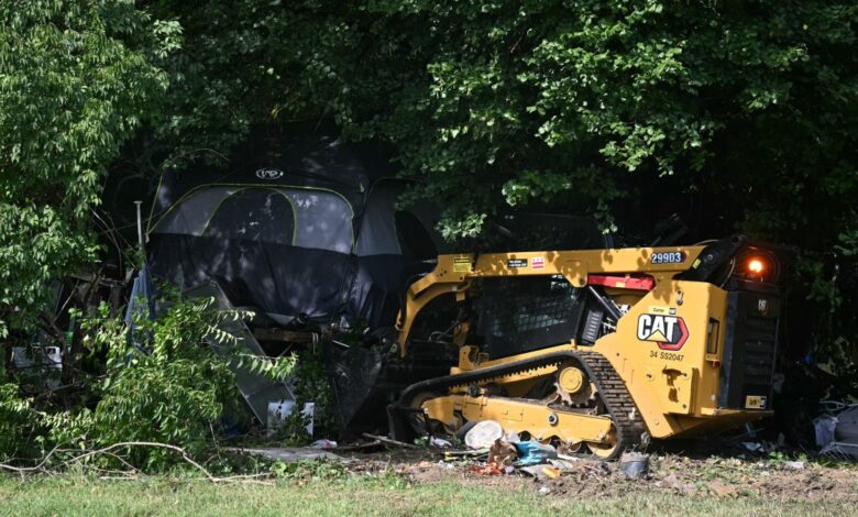 Ve čtvrtek tábor bez domova poblíž centra Kennedy – Pro které Trump slouží jako předseda – demontovali městští pracovníci, kteří strčili lidské věci do kamionů na popelnici.