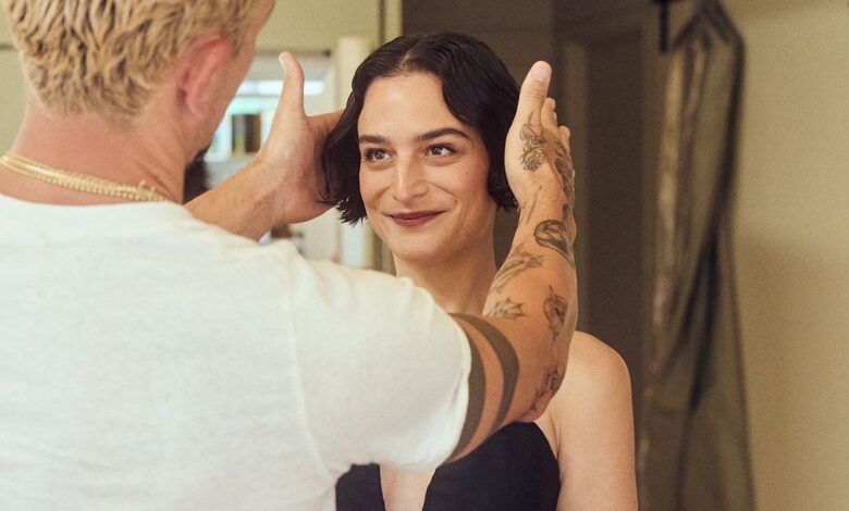 Po Jenny Slate Zabalené střelby pro Umírání na sexVe kterém hraje Nikki, freewheeling thespian, který se stará o svého nejlepšího přítele, který má rakovinu terminálu, zkrátila si vlasy. „Emocionálně řečeno,“ říká Vf„Po celou dobu se pro mě tolik děje, že už se mi moc nelíbí hodně rozruchu kolem mé fyzičnosti.“ V neděli večer Obřad Emmys 2025kde obdržela svou první nominaci na vynikající podpůrnou herečku v omezené sérii, její kadeřník Jordan m dal mu střední část a ohyb rámcové. Nový styl je druh dramatické změny, kterou by se dalo očekávat od klasického rozpadu – a v některých ohledech je. Přehlídka, jak říká, jí pomohla pustit se do nějaké hluboce zakořeněné sebekritiky a vynořila se s nově nalezeným sebepochopení. „Nemohu se zkroutit ani se příliš obloučit, abych se pokusil poslat zprávu každému, než pošlete zprávu o tom, co se děje. Vlastně velmi dobře vím, jak se rád cítím a jak rád vypadám.“