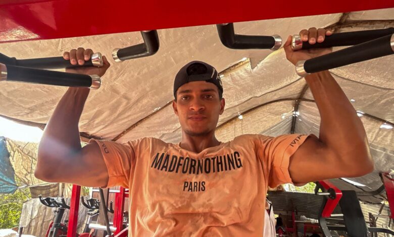 23letý Palestinec úmyslně udržuje své tréninkové sezení minimální, bolestivé snížení z intenzivních rutin, které kdysi miloval-ale na území, kde téměř každý hladoví, udržování svalové hmoty se stalo aktem přežití a odporu.