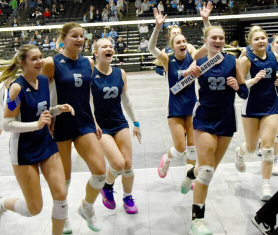 Hráči Philipa Barboura slaví poté, co ve středu odpoledne porazili South Harrison ve svém prvním zápase na státním volejbalovém turnaji třídy AA. Lady Colts postoupily do dnešního mistrovského zápasu proti nejlépe nasazenému Oak Glen později večer vítězstvím 3:1 nad Wheeling Central, který se dostal z prohry v prvním setu.