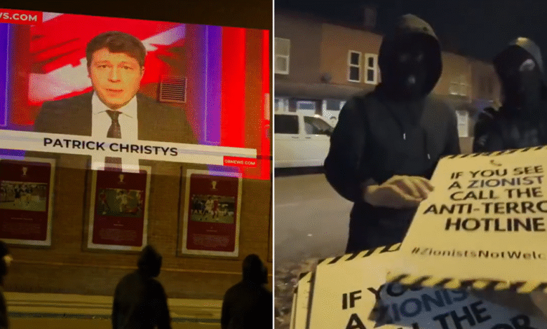 Aktivisté pro Gazu, oblečení v černých šatech a maskách, sdíleli video, na kterém je vidět, jak vysílají Patricka Christyse z GB News do Villa Parku před dnešním utkáním Maccabi Tel Aviv.