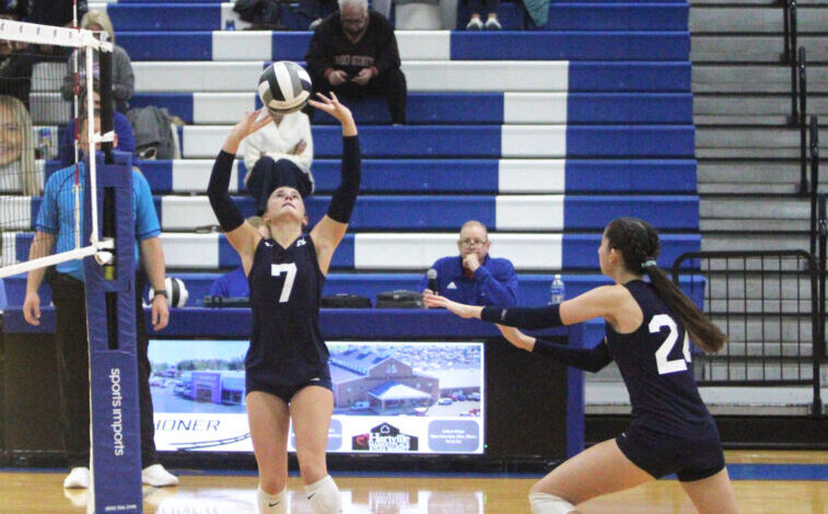 Fotografie zaměstnanců / Dan Hiner McDonald’s Ava Salomone (7) zaútočila na Halle Kuntz během čtvrtečního regionálního semifinále divize VI proti Independence na Uniontown Lake High School.