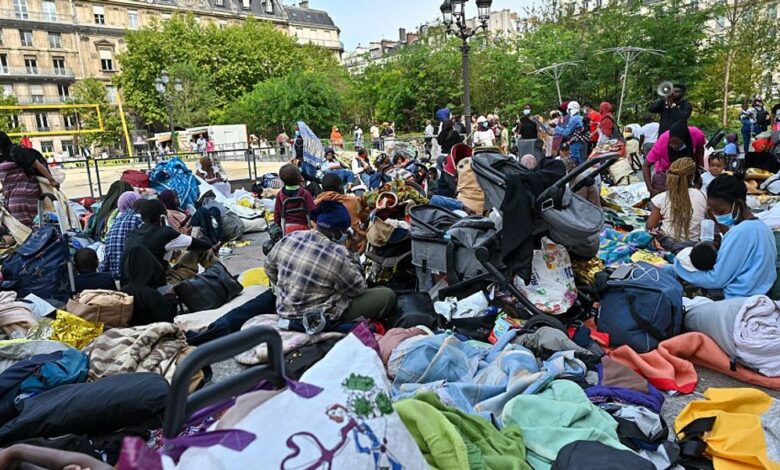 V rámci nejnovějších demonstrací v Paříži byly desítky rodin viděny spící na podlaze pomocí plachtových listů jako střech, než byly v úterý evakuovány.