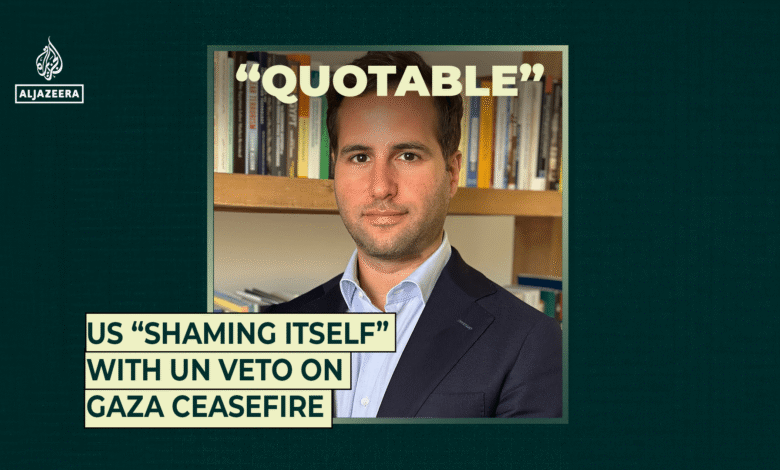 Omar Rahman, člen rady Středního východu pro globální záležitosti, hovoří o samotném „hanbě“ USA se svým veto rezoluce příměří Gazy v OSN.
