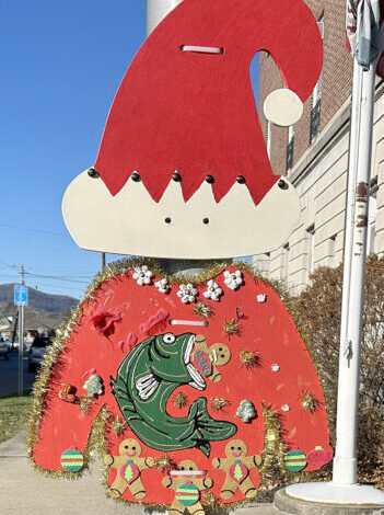 Fotografie Inter-Mountain od Taylora McKinnieho Před Elkinsovou radnicí stojí elf v červeném klobouku a svetru, který ukazuje rybu, jak jí perník.