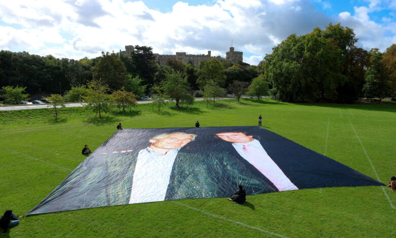 Aktivisté rozvinuli obří fotografii amerického prezidenta Donalda Trumpa s odsouzeným sexuálním delikventem Jeffreyem Epsteinem poblíž hradu Windsor v úterý, kde je král Charles nastaven, aby ho během své státní návštěvy hostil.