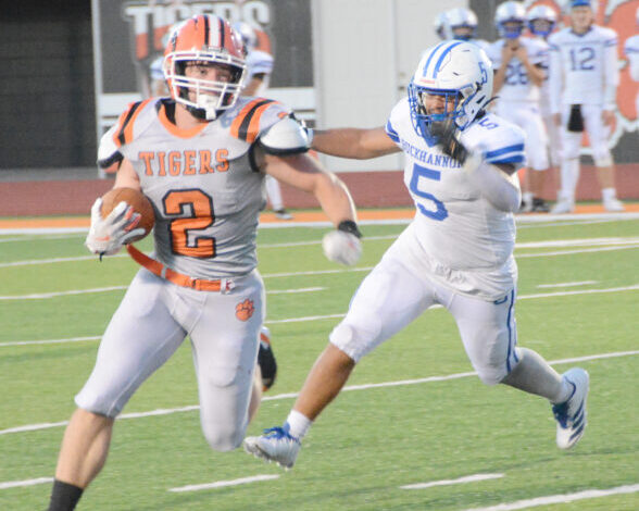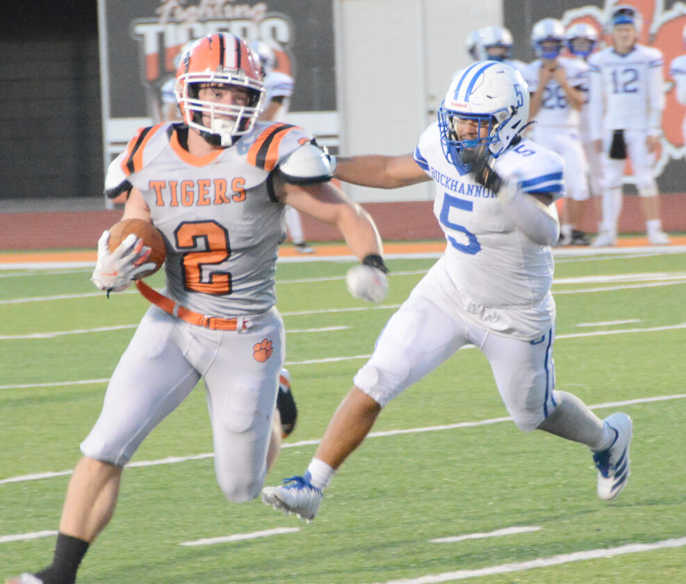 Fotografie mezi Mountain od Joey Kittle Elkins High’s Seth Robinson se dostane ven na dlouhý zisk, protože Buckhannon Upshur Chance Morgan pronásleduje pátek večer na Tiger Stadium. Robinson spěchal 270 yardů a tři skóre ve vítězství Tigers ’57-29.