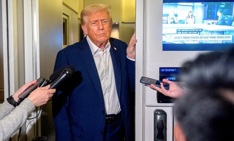 Prezident Donald Trump hovoří s novináři na palubě Air Force One na cestě do Asie, pátek 24. října 2025. (Fotografie Marka Schiefelbeina/AP)