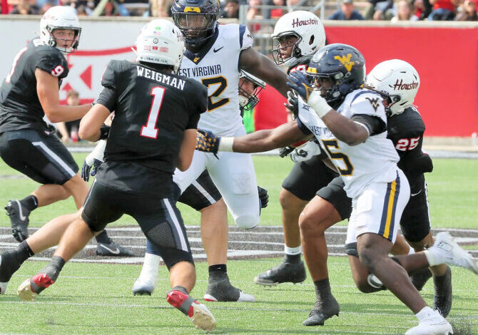 Soubor foto Obránci WVU během sobotního zápasu vyvíjejí tlak na obránce Houstonu Connora Weigmana.