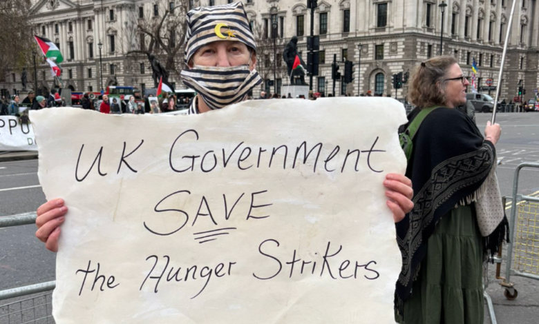 Jednotlivec byl spatřen, jak drží ceduli vyzývající britskou vládu, aby „zachránila“ hladovkáře napojené na Palestinu.