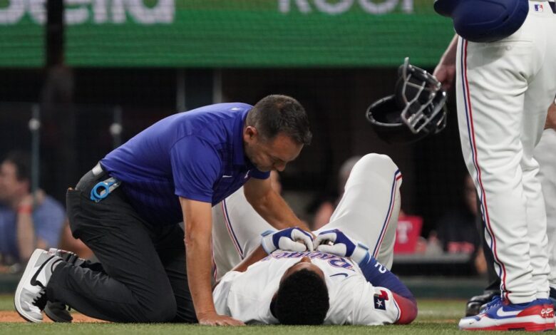 Strážci vedli 4-2 ve třetím na dvou-běhovém singlu Adolis García, bezprostředně po Strašidelný okamžik, kdy byl zasažen návěs Na ušní klapce jeho helmy u Granta Holmese’s Fastball.