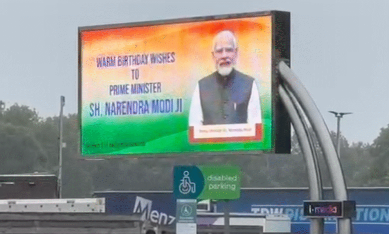Spolu s obrázkem pana Modiho, zpráva na digitálním billboardu zněla: „Vřelé narozeniny si přeje premiérovi Sh. Narendra Modi Ji.“