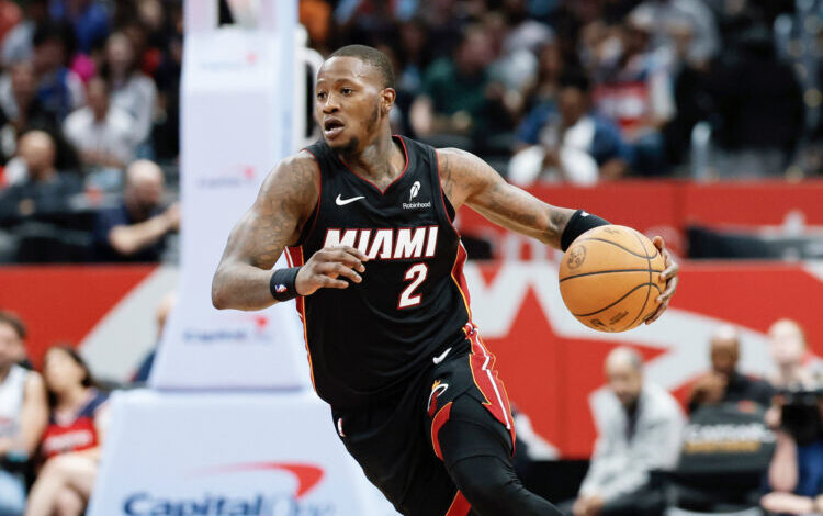 FILE – Strážce Miami Heat Terry Rozier (2) přináší míč do kurtu během druhé poloviny zápasu basketbalové NBA proti Washington Wizards ve Washingtonu, pondělí 31. března 2025. (AP Photo/Terrance Williams, File)