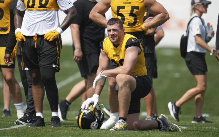 Pittsburgh Steelers Linebacker TJ Watt (90) si udělá přestávku během výcvikového tábora NFL fotbalového týmu v Latrobe, Pa., Čtvrtek 24. července 2025. (AP Photo/Gene J. Puskar)