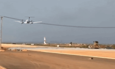 Letadlo je vidět během zkušebního letu na letišti Long Thanh v provincii Dong Nai, 1. srpna 2025. Video od místních lidí