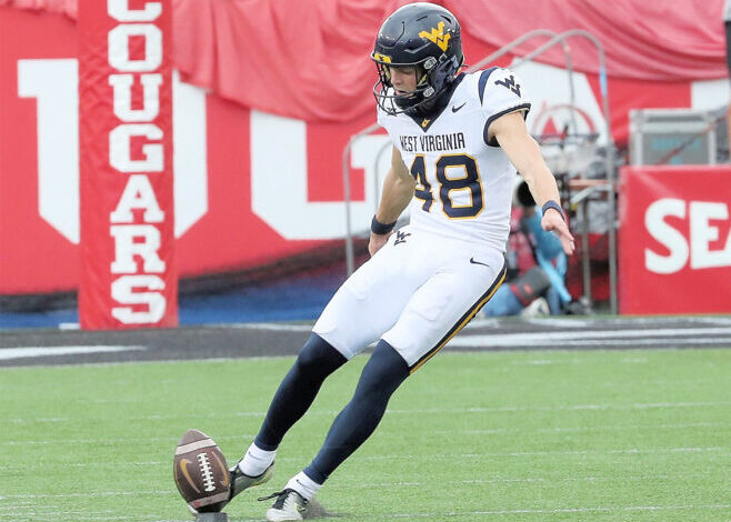 Foto s laskavým svolením BlueGoldNews.com Senior kick-on kicker Nate Flower odstartoval během zápasu WVU v Houstonu.