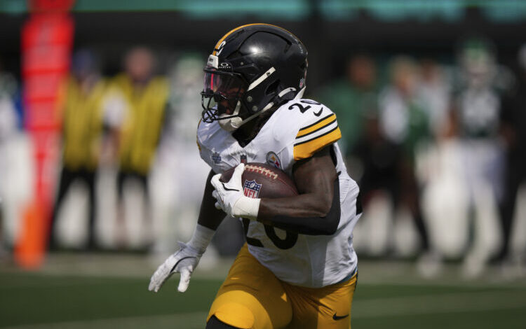 Kaleb Johnson Pittsburgh Steelers hraje během fotbalové hry NFL neděle 7. září 2025 ve východním Rutherfordu, NJ (AP Photo/Matt Slocum)