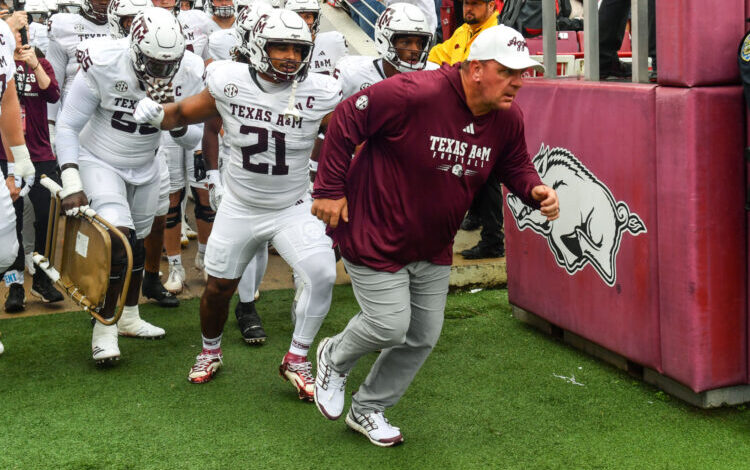 Mike Elko z Texas A&M vede svůj tým na hřiště, aby se utkal s Arkansasem během fotbalového zápasu NCAA v sobotu 18. října 2025 ve Fayetteville, Ark. (AP Photo/Michael Woods)