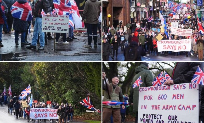 Tisíce lidí se sjely do Crowborough na protest proti plánu ubytovat 600 migrantů v armádním táboře Sussex