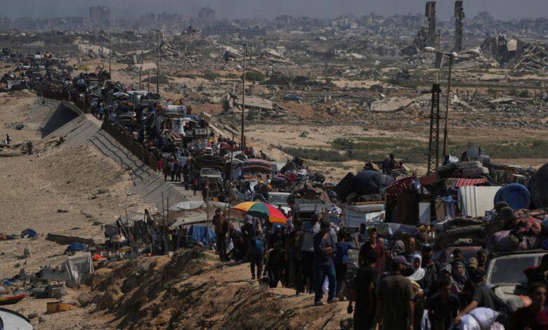 „Gaza hoří,“ řekl izraelský ministr obrany Izrael Izrael Katz na X, jako sloupce dodávek a oslí vozíky naložené nábytkem a lidé, kteří nosí nosí poslední ze svého světského majetku, se napařeli po pobřežní ulici Al-Rashid Street na pozadí černého kouře, z nichž stoupal z zničené město.