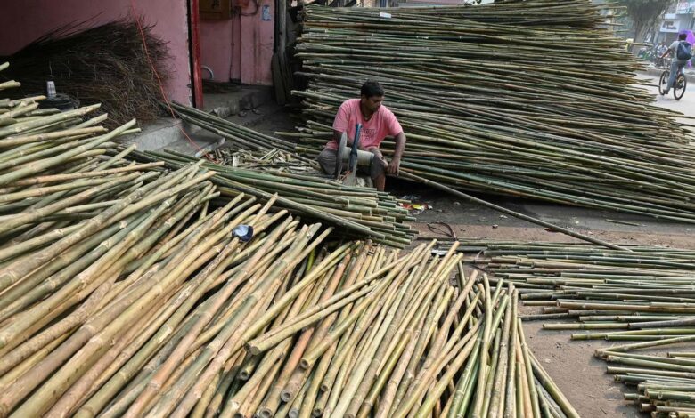 Dělník připravuje košťata z bambusu v obchodě u silnice v Ahmedabad 28. listopadu 2025. | Fotografický kredit: AFP