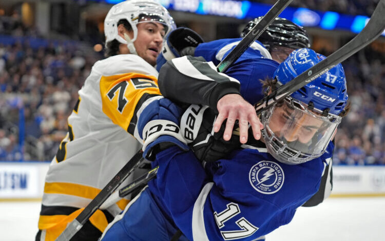 Centr Tampy Bay Lightning Dominic James (17) a obránce Pittsburgh Penguins Connor Clifton (75) se během druhé třetiny hokejového zápasu NHL ve čtvrtek 4. prosince 2025 v Tampě na Floridě vyřadili (AP Photo/Chris O’Meara)