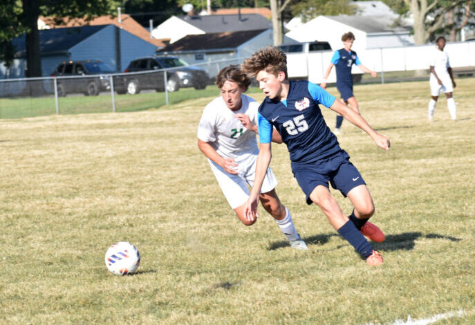 Zaměstnanci Foto / Preston Byers Ursuline’s Gavin Hauch (21) a Warren JFK Jack Burrows bojují o míč během irského vítězství 2-0 nad Eagles v úterý ve Warrenu.
