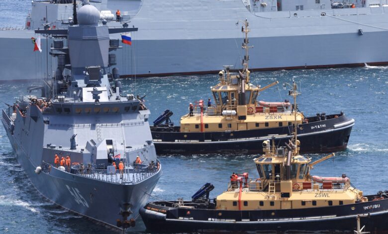 Ruské plavidlo připlouvá na námořní základnu Simon’s Town před námořním cvičením BRICS Plus (Esa Alexander/Reuters)