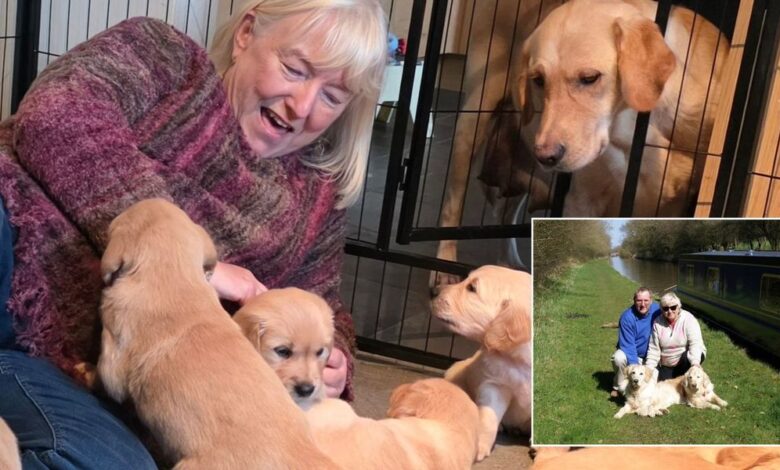 Velšská vdova viděla, že odkaz jejího zesnulého manžela pokračuje prostřednictvím vodicích psů, když se citově znovu shledala se zlatým retrívrem pojmenovaným na památku jejího zesnulého manžela, spolu s vrhem 10 štěňat.