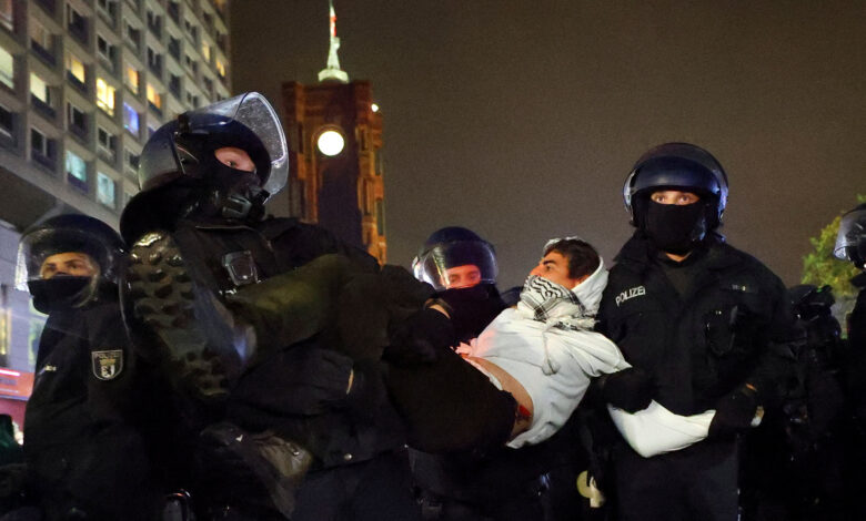 Videa ukazují, že němečtí policisté porazili pro-Palestinské protestující v Berlíně poté, co úřady zakázaly plánovanou demonstraci. Asi 500 lidí se shromáždilo poblíž berlínské radnice, které zpívalo slogany a mávali vlajkami, než bylo napadeno a zadrženo.