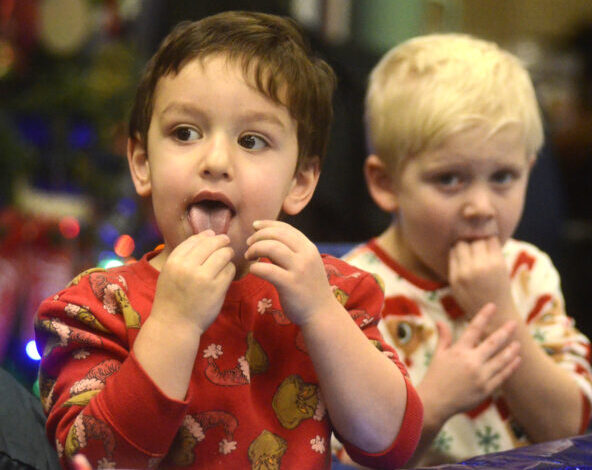 121625…R POLAR EXPRESS 1…Niles…12-16-25…TCBDD pořádá Den Polar Express…Předškoláci Matteo Butto, 3, z Niles, vlevo, a Brenton Wilson, 3, z Mineral Ridge, si olizují prsty po zdobení a konzumaci vánočního cukroví na sváteční akci…od R. Michaela Semplea