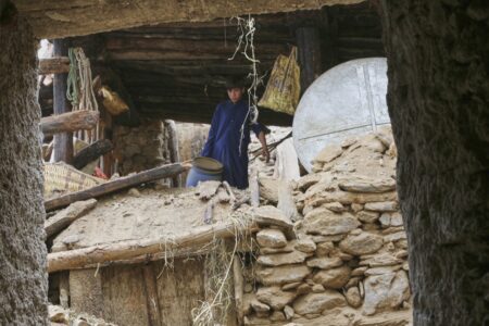 Místní obyvatel prochází částečně zhrouceným domem v oblasti zničené nedělním mocným zemětřesením 6,0 magnitude, které zabilo mnoho lidí a zničila vesnice ve východním Afghánistánu v provincii Dara Noor v provincii Kunar, úterý 2. září 2025. (AP Photo/Wahidullah Kakar)