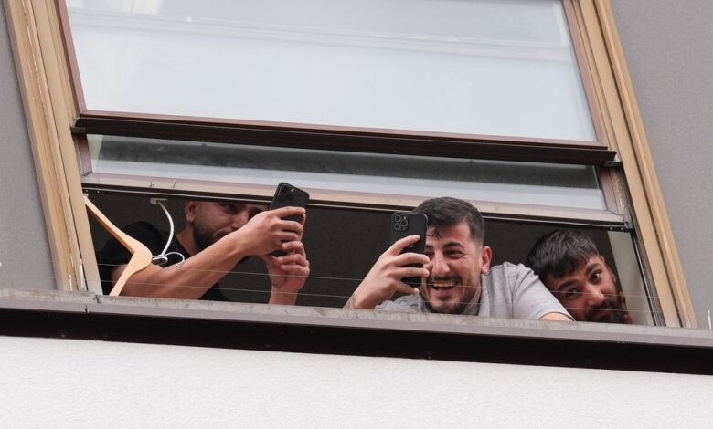 Mladí muži věřili, že jsou žadatelé o azyl uvnitř hotelu Thistle City Barbican v centru Londýna, zamávali a vyhodili polibky na protestující.