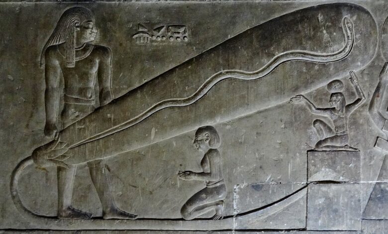 Řezby v chrámovém komplexu Dendera, které někteří navrhují zobrazovat starověká elektrická zařízení a vyvolávají debaty o technologických schopnostech raných civilizací. Kredit: Olaf Tausch. CC od 3.0