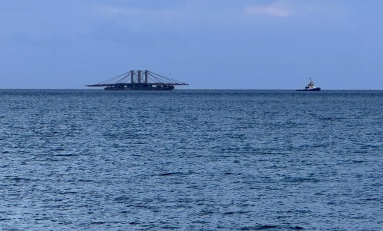 150metrová stavba, lemovaná remorkéry, zanechala expaty i místní obyvatele zmatené svým velmi nenámořním designem připomínajícím visutý most.