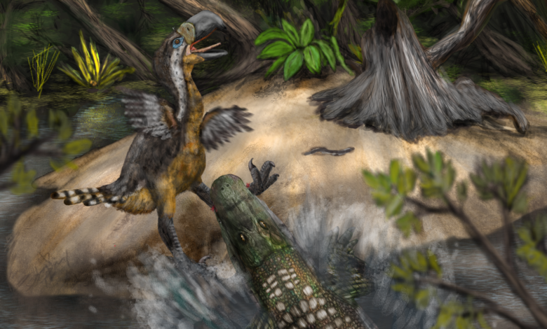 Fosilizované kousnutí naznačují, že by mohl být dramatický tussle mezi gigantickým teroristickým ptákem a ještě masivnějším krokodýlem asi před 12 miliony let.