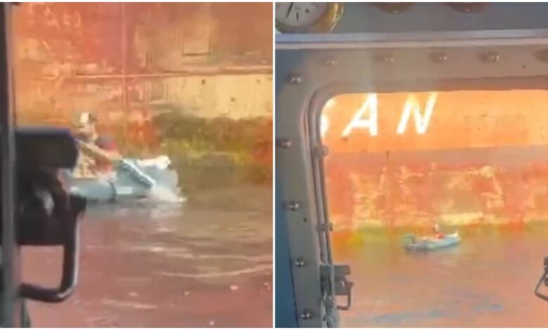 Posádka s orlíma očima na palubě obchodní lodi Epický Shikoku v pondělí těsně po obědě zahlédl nejmenovaného muže, jak se pohupuje nahoru a dolů na svém provizorním plavidle.