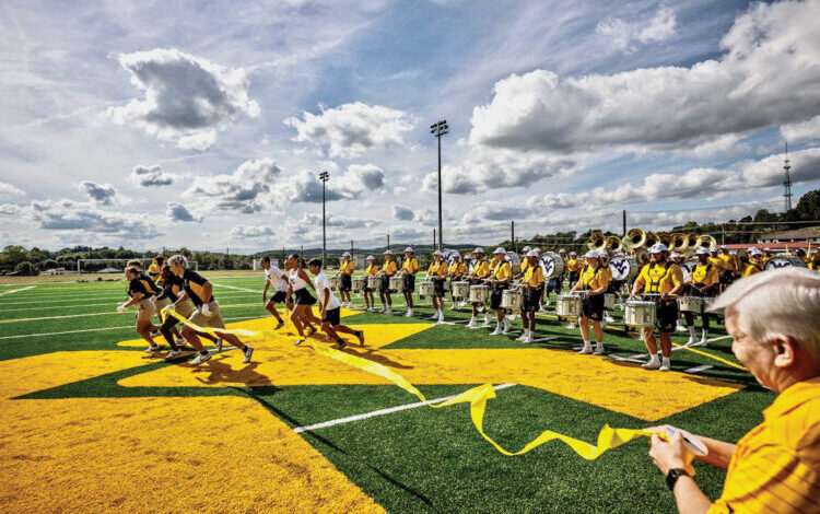 MORGANTOWN – Získání formace, členové pochodující kapely Univerzitní horolezectví West Virginia University oficiálně prořízli stuhu pro nové pole Pride Practice s prezidentem Michaelem T. Bensonem, zástupci WVU College of Creative Arts and Media, WVU Foundation a WVU divize studentského života a další příznivci 29. srpna.